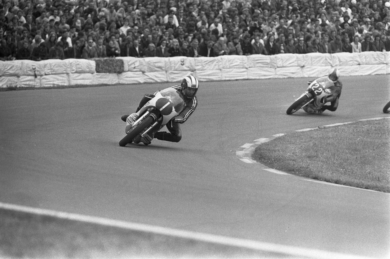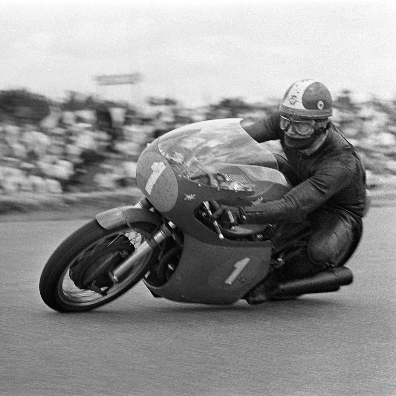 Auch die großen Namen des Sports wie Phil Read ( Startnummer 1 auf dem unteren Bild) übernahmen diese Technik recht schnell. Bei einem amerikanischen Nachwuchsfahrer hat Saarinen wohl einen bleibenden eindruck hinterlassen. Kenny Roberts Senior übernahm die Fahrtechnik und trieb sie auf die Spitze. Statt der Fußspitze nutzte Roberts sein Knie als Indikator für die Schräglage und etablierte damit den Kneedown also also das schleifen des Knies in der Kurve als Fahrtechnik. Die damlaige Schutzkleidung der Fahrer war nicht darauf ausgelegt, dass irgendetwas bewusst auf der Straße schleift.Und blankes Leder bremst auf Aspahlt. Die heute bekannten Knieschleifer waren noch nicht erfunden. Also haben sich die fahrer selbst geholfen. Randy Marmola zum Beispiel hat alte Visire von seinen Helmen mit Panzertap an seinem Knie befestigt. Einem Urban-Myth nach sind auch die ersten Rückenprotektoren aus Helmvisiren entstanden.